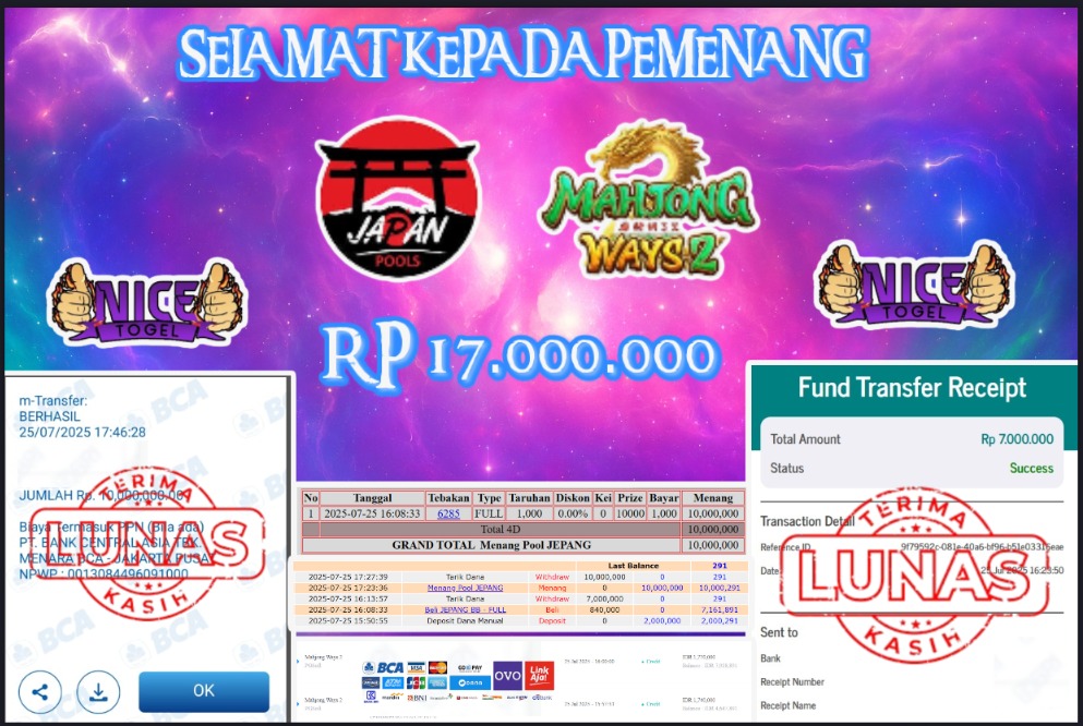Selamat kepada User id : ASRTY** Telah berhasil mendapatkan kemenangan besar pada permainan JACKPOT BERUNTUN MAHJONG WAYS 2 & TOGEL JAPAN POOLS Dengan kemenangan Sebesar Rp.17.000.000,- Setelah mengisi formulir withdraw dengan kurung waktu hanya 5 – 10 menit pihak NICETOGEL sudah melakukan transfer kepada pemilik Userid dan dana sudah dapat di cairkan oleh pemenang. Bukti pembayaran yang kami berikan merupakan bukti pembayaran yang SAH / VALID yang langung di dapatkan melaui tanda transfer transaksi dari Bank yang di tuju.