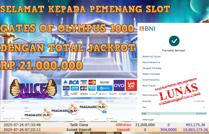 Selamat kepada User id : TUTI7** Telah berhasil mendapatkan kemenangan besar pada permainan BUKTI JACKPOT SLOT GATES OF OLYMPUS 1000 Rp 21.000.000,- LUNAS Dengan kemenangan Sebesar Rp.21.000.000,- Setelah mengisi formulir withdraw dengan kurung waktu hanya 5 – 10 menit pihak NICETOGEL sudah melakukan transfer kepada pemilik Userid dan dana sudah dapat di cairkan oleh pemenang. Bukti pembayaran yang kami berikan merupakan bukti pembayaran yang SAH / VALID yang langung di dapatkan melaui tanda transfer transaksi dari Bank yang di tuju.