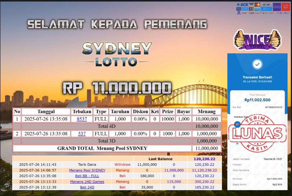 Selamat kepada User id : GRM** Telah berhasil mendapatkan kemenangan besar pada permainan JACKPOT TOGEL SYDNEY LOTTO Dengan kemenangan Sebesar Rp.11.000.000,- Setelah mengisi formulir withdraw dengan kurung waktu hanya 5 – 10 menit pihak NICETOGEL sudah melakukan transfer kepada pemilik Userid dan dana sudah dapat di cairkan oleh pemenang. Bukti pembayaran yang kami berikan merupakan bukti pembayaran yang SAH / VALID yang langung di dapatkan melaui tanda transfer transaksi dari Bank yang di tuju.