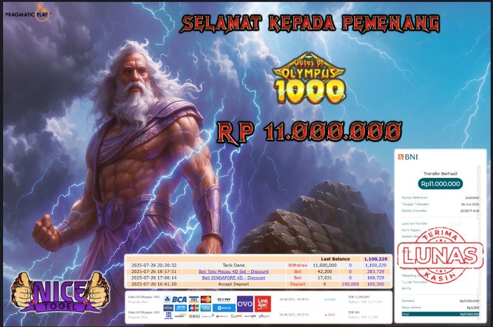 Selamat kepada User id : YHS78** Telah berhasil mendapatkan kemenangan besar pada permainan BUKTI JACKPOT SLOT GATES OF OLYMPUS 1000 Rp 11.000.000,- LUNAS Dengan kemenangan Sebesar Rp.21.000.000,- Setelah mengisi formulir withdraw dengan kurung waktu hanya 5 – 10 menit pihak NICETOGEL sudah melakukan transfer kepada pemilik Userid dan dana sudah dapat di cairkan oleh pemenang. Bukti pembayaran yang kami berikan merupakan bukti pembayaran yang SAH / VALID yang langung di dapatkan melaui tanda transfer transaksi dari Bank yang di tuju.