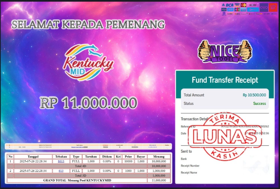 Selamat kepada User id : BOMB** Telah berhasil mendapatkan kemenangan besar pada permainan BUKTI JACKPOT TOGEL KENTUCKY MID Rp11.000.000,- LUNAS Dengan kemenangan Sebesar Rp.21.000.000,- Setelah mengisi formulir withdraw dengan kurung waktu hanya 5 – 10 menit pihak NICETOGEL sudah melakukan transfer kepada pemilik Userid dan dana sudah dapat di cairkan oleh pemenang. Bukti pembayaran yang kami berikan merupakan bukti pembayaran yang SAH / VALID yang langung di dapatkan melaui tanda transfer transaksi dari Bank yang di tuju.
