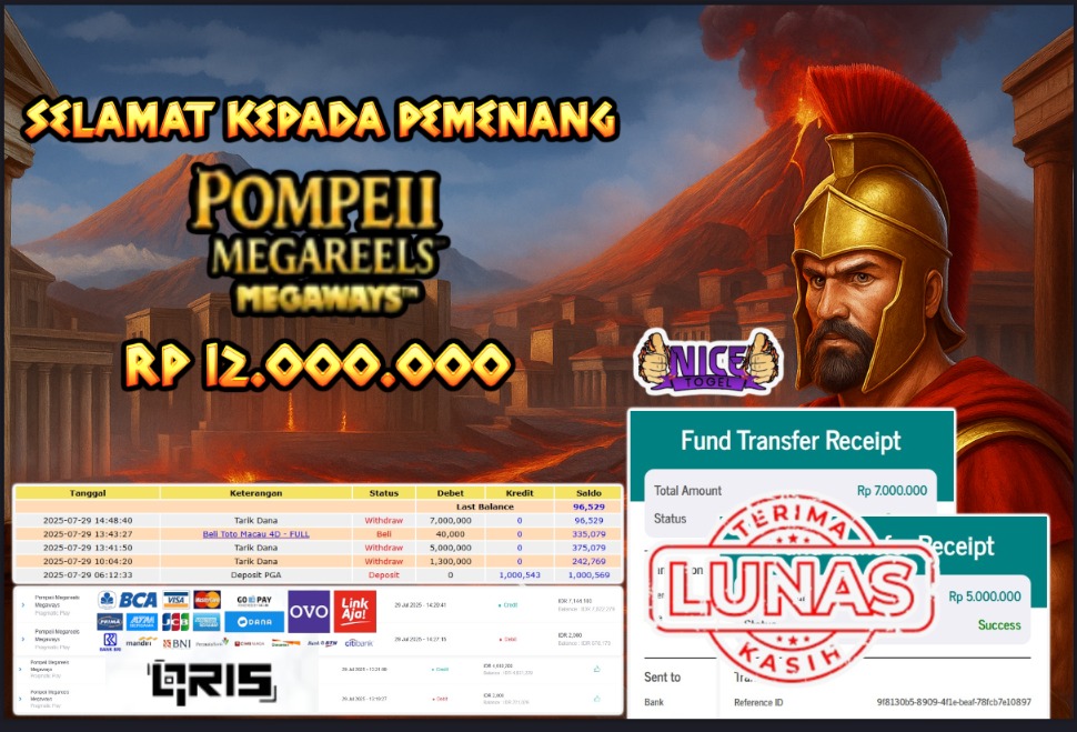 Selamat kepada User id : SY23*** Telah berhasil mendapatkan kemenangan besar pada permainan JACKPOT SLOT POMPEII MEGAREELS MEGAWAYS Dengan kemenangan Sebesar Rp.12.000.000,- Setelah mengisi formulir withdraw dengan kurung waktu hanya 5 – 10 menit pihak NICETOGEL sudah melakukan transfer kepada pemilik Userid dan dana sudah dapat di cairkan oleh pemenang. Bukti pembayaran yang kami berikan merupakan bukti pembayaran yang SAH / VALID yang langung di dapatkan melaui tanda transfer transaksi dari Bank yang di tuju.