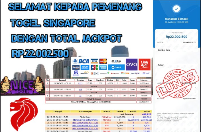 Selamat kepada User id : APIK** Telah berhasil mendapatkan kemenangan besar pada permainan JACKPOT TOGEL SINGAPORE Dengan kemenangan Sebesar Rp.22.002.500.00,- Setelah mengisi formulir withdraw dengan kurung waktu hanya 5 – 10 menit pihak NICETOGEL sudah melakukan transfer kepada pemilik Userid dan dana sudah dapat di cairkan oleh pemenang. Bukti pembayaran yang kami berikan merupakan bukti pembayaran yang SAH / VALID yang langung di dapatkan melaui tanda transfer transaksi dari Bank yang di tuju.