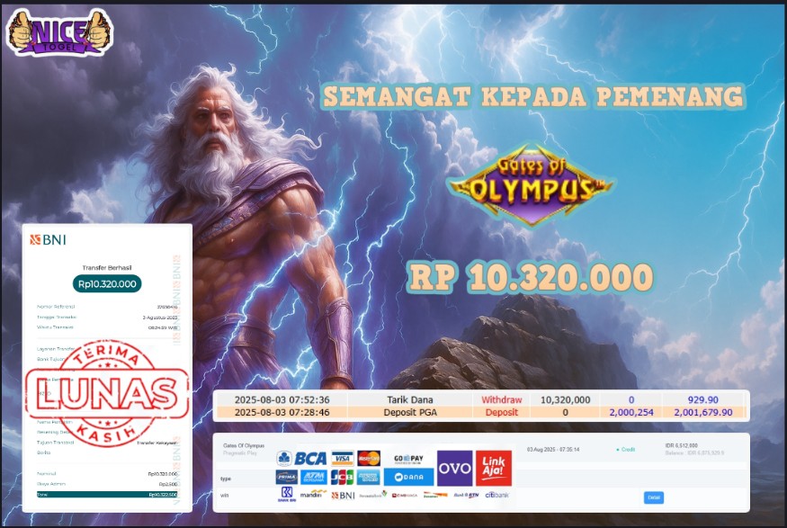 Selamat kepada User id : NUHS** Telah berhasil mendapatkan kemenangan besar pada permainan JACKPOT SLOT GATES OF OLYMPUS Dengan kemenangan Sebesar Rp.10.320.000,- Setelah mengisi formulir withdraw dengan kurung waktu hanya 5 – 10 menit pihak NICETOGEL sudah melakukan transfer kepada pemilik Userid dan dana sudah dapat di cairkan oleh pemenang. Bukti pembayaran yang kami berikan merupakan bukti pembayaran yang SAH / VALID yang langung di dapatkan melaui tanda transfer transaksi dari Bank yang di tuju.
