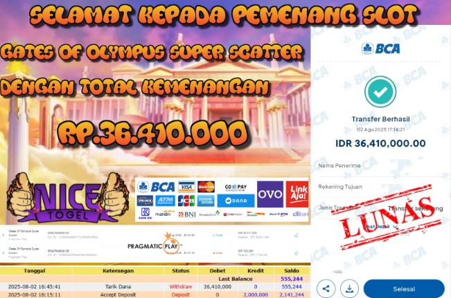 Selamat kepada User id : AYU8** Telah berhasil mendapatkan kemenangan besar pada permainan JACKPOT SLOT GATES OF OLYMPUS SCATTER Dengan kemenangan Sebesar Rp.36.410.000,- Setelah mengisi formulir withdraw dengan kurung waktu hanya 5 – 10 menit pihak NICETOGEL sudah melakukan transfer kepada pemilik Userid dan dana sudah dapat di cairkan oleh pemenang. Bukti pembayaran yang kami berikan merupakan bukti pembayaran yang SAH / VALID yang langung di dapatkan melaui tanda transfer transaksi dari Bank yang di tuju.
