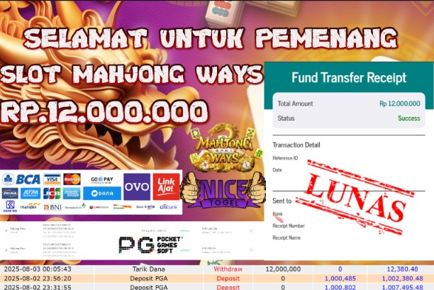 Selamat kepada User id : 885** Telah berhasil mendapatkan kemenangan besar pada permainan JACKPOT SLOT MAHJONG WAYS Dengan kemenangan Sebesar Rp.12.000.000,- Setelah mengisi formulir withdraw dengan kurung waktu hanya 5 – 10 menit pihak NICETOGEL sudah melakukan transfer kepada pemilik Userid dan dana sudah dapat di cairkan oleh pemenang. Bukti pembayaran yang kami berikan merupakan bukti pembayaran yang SAH / VALID yang langung di dapatkan melaui tanda transfer transaksi dari Bank yang di tuju.