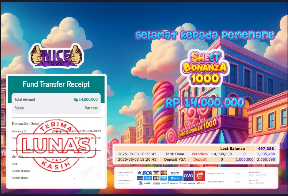 Selamat kepada User id : AFIF** Telah berhasil mendapatkan kemenangan besar pada permainan JACKPOT SLOT SWEET BONANZA Dengan kemenangan Sebesar Rp.14.000.000,- Setelah mengisi formulir withdraw dengan kurung waktu hanya 5 – 10 menit pihak NICETOGEL sudah melakukan transfer kepada pemilik Userid dan dana sudah dapat di cairkan oleh pemenang. Bukti pembayaran yang kami berikan merupakan bukti pembayaran yang SAH / VALID yang langung di dapatkan melaui tanda transfer transaksi dari Bank yang di tuju.