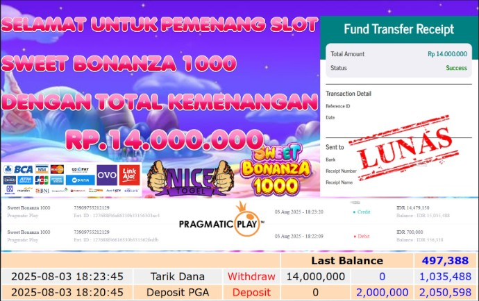 Selamat kepada User id : HANIF** Telah berhasil mendapatkan kemenangan besar pada permainan JACKPOT SLOT SWEET BONANZA 1000 Dengan kemenangan Sebesar Rp.14.000.000,- Setelah mengisi formulir withdraw dengan kurung waktu hanya 5 – 10 menit pihak NICETOGEL sudah melakukan transfer kepada pemilik Userid dan dana sudah dapat di cairkan oleh pemenang. Bukti pembayaran yang kami berikan merupakan bukti pembayaran yang SAH / VALID yang langung di dapatkan melaui tanda transfer transaksi dari Bank yang di tuju.