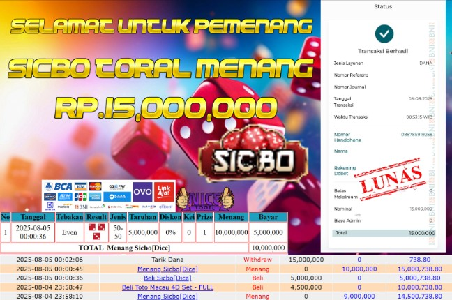 Selamat kepada User id : APIP52*** Telah berhasil mendapatkan kemenangan besar pada permainan JACKPOT SICBO Dengan kemenangan Sebesar Rp.15.000.000,- Setelah mengisi formulir withdraw dengan kurung waktu hanya 5 – 10 menit pihak NICETOGEL sudah melakukan transfer kepada pemilik Userid dan dana sudah dapat di cairkan oleh pemenang. Bukti pembayaran yang kami berikan merupakan bukti pembayaran yang SAH / VALID yang langung di dapatkan melaui tanda transfer transaksi dari Bank yang di tuju.
