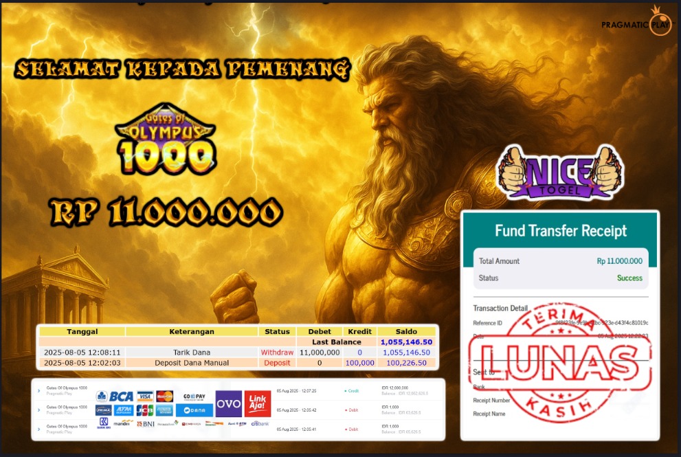 Selamat kepada User id : BOSS6** Telah berhasil mendapatkan kemenangan besar pada permainan JACKPOT SLOT GATES OF OLYMPUS 1000 Dengan kemenangan Sebesar Rp.11.000.000,- Setelah mengisi formulir withdraw dengan kurung waktu hanya 5 – 10 menit pihak NICETOGEL sudah melakukan transfer kepada pemilik Userid dan dana sudah dapat di cairkan oleh pemenang. Bukti pembayaran yang kami berikan merupakan bukti pembayaran yang SAH / VALID yang langung di dapatkan melaui tanda transfer transaksi dari Bank yang di tuju.