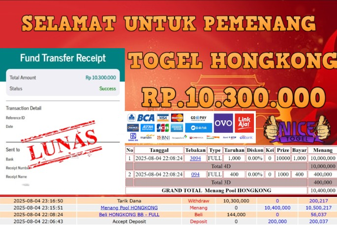 Selamat kepada User id : AZI7*** Telah berhasil mendapatkan kemenangan besar pada permainan JACKPOT TOGEL HONGKONG Dengan kemenangan Sebesar Rp.10.300.000,- Setelah mengisi formulir withdraw dengan kurung waktu hanya 5 – 10 menit pihak NICETOGEL sudah melakukan transfer kepada pemilik Userid dan dana sudah dapat di cairkan oleh pemenang. Bukti pembayaran yang kami berikan merupakan bukti pembayaran yang SAH / VALID yang langung di dapatkan melaui tanda transfer transaksi dari Bank yang di tuju.