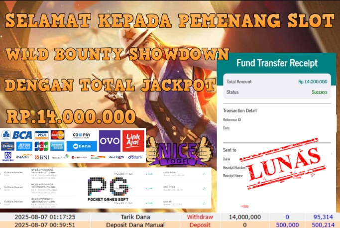 Selamat kepada User id : HERO*** Telah berhasil mendapatkan kemenangan besar pada permainan SLOT WILD BOUNTY SHOWDOWN Dengan kemenangan Sebesar Rp.14.000.000,- Setelah mengisi formulir withdraw dengan kurung waktu hanya 5 – 10 menit pihak NICETOGEL sudah melakukan transfer kepada pemilik Userid dan dana sudah dapat di cairkan oleh pemenang. Bukti pembayaran yang kami berikan merupakan bukti pembayaran yang SAH / VALID yang langung di dapatkan melaui tanda transfer transaksi dari Bank yang di tuju.