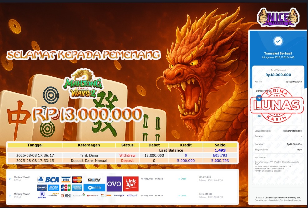 Selamat kepada User id : AIY*** Telah berhasil mendapatkan kemenangan besar pada permainan SLOT MAHYONG WAYS 2 Dengan kemenangan Sebesar Rp.13.000.000,- Setelah mengisi formulir withdraw dengan kurung waktu hanya 5 – 10 menit pihak NICETOGEL sudah melakukan transfer kepada pemilik Userid dan dana sudah dapat di cairkan oleh pemenang. Bukti pembayaran yang kami berikan merupakan bukti pembayaran yang SAH / VALID yang langung di dapatkan melaui tanda transfer transaksi dari Bank yang di tuju.