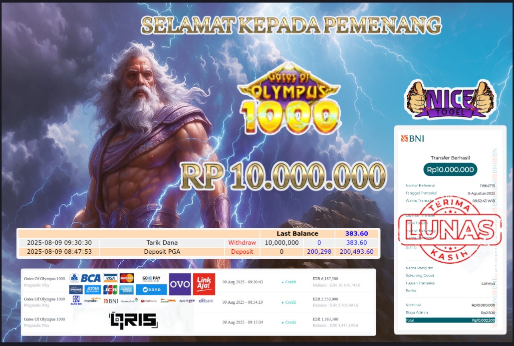 Selamat kepada User id : MISD87** Telah berhasil mendapatkan kemenangan besar pada permainan JACKPOT SLOT GATES OF OLYMPUS 1000 Dengan kemenangan Sebesar Rp.10.000.000,- Setelah mengisi formulir withdraw dengan kurung waktu hanya 5 – 10 menit pihak NICETOGEL sudah melakukan transfer kepada pemilik Userid dan dana sudah dapat di cairkan oleh pemenang. Bukti pembayaran yang kami berikan merupakan bukti pembayaran yang SAH / VALID yang langung di dapatkan melaui tanda transfer transaksi dari Bank yang di tuju.