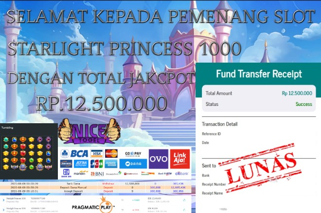 Selamat kepada User id :GADIS*** Telah berhasil mendapatkan kemenangan besar pada permainan JACKPOT SLOT STARLIGHT PRINCESS 1000 Dengan kemenangan Sebesar Rp.12.500.000,- Setelah mengisi formulir withdraw dengan kurung waktu hanya 5 – 10 menit pihak NICETOGEL sudah melakukan transfer kepada pemilik Userid dan dana sudah dapat di cairkan oleh pemenang. Bukti pembayaran yang kami berikan merupakan bukti pembayaran yang SAH / VALID yang langung di dapatkan melaui tanda transfer transaksi dari Bank yang di tuju.