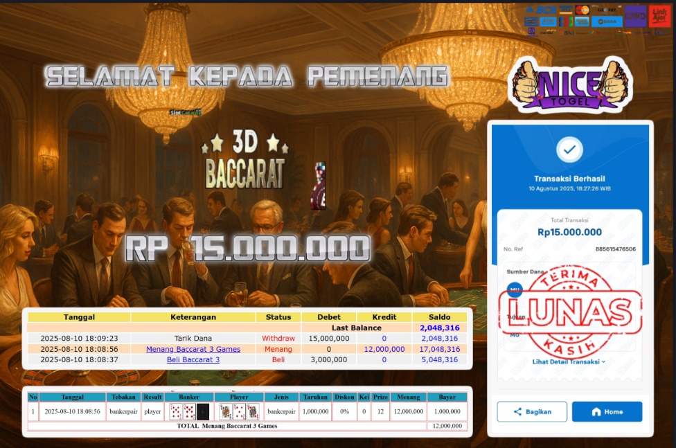 Selamat kepada User id : NIS65*** Telah berhasil mendapatkan kemenangan besar pada permainan BACCARAT Dengan kemenangan Sebesar Rp.15.000.000,- Setelah mengisi formulir withdraw dengan kurung waktu hanya 5 – 10 menit pihak NICETOGEL sudah melakukan transfer kepada pemilik Userid dan dana sudah dapat di cairkan oleh pemenang. Bukti pembayaran yang kami berikan merupakan bukti pembayaran yang SAH / VALID yang langung di dapatkan melaui tanda transfer transaksi dari Bank yang di tuju.
