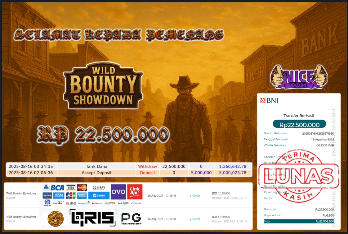 Selamat kepada User id : BYTS*** Telah berhasil mendapatkan kemenangan besar pada permainan WILD BOUNTY SHOWDOWN Dengan kemenangan Sebesar Rp.22.500.000,- Setelah mengisi formulir withdraw dengan kurung waktu hanya 5 – 10 menit pihak NICETOGEL sudah melakukan transfer kepada pemilik Userid dan dana sudah dapat di cairkan oleh pemenang. Bukti pembayaran yang kami berikan merupakan bukti pembayaran yang SAH / VALID yang langung di dapatkan melaui tanda transfer transaksi dari Bank yang di tuju.