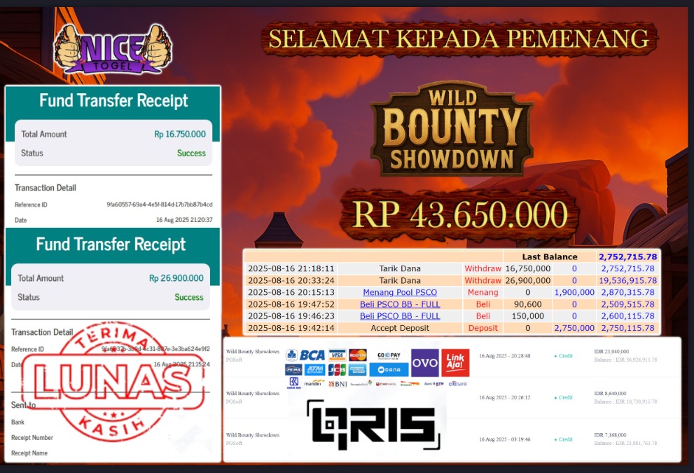 Selamat kepada User id : JCK56*** Telah berhasil mendapatkan kemenangan besar pada permainan WILD BOUNTY SHOWDOWN Dengan kemenangan Sebesar Rp.43.650.000,- Setelah mengisi formulir withdraw dengan kurung waktu hanya 5 – 10 menit pihak NICETOGEL sudah melakukan transfer kepada pemilik Userid dan dana sudah dapat di cairkan oleh pemenang. Bukti pembayaran yang kami berikan merupakan bukti pembayaran yang SAH / VALID yang langung di dapatkan melaui tanda transfer transaksi dari Bank yang di tuju.