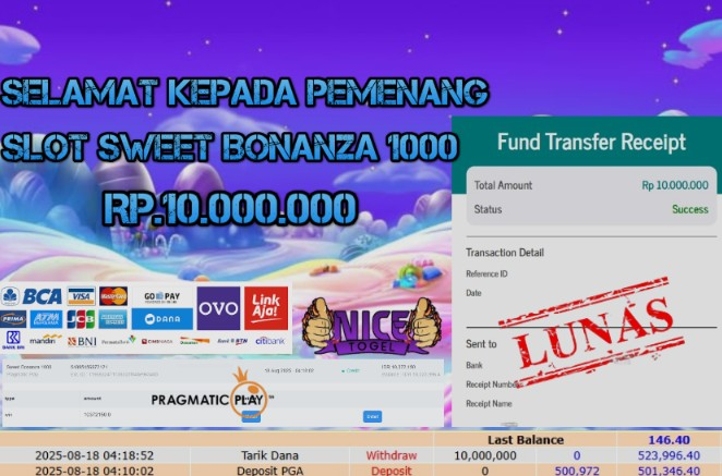 Selamat kepada User id : AZIJ** Telah berhasil mendapatkan kemenangan besar pada permainan BUKTI JACKPOT SWEET BONANZA 1000 Rp10.000.000,- LUNAS Setelah mengisi formulir withdraw dengan kurung waktu hanya 5 – 10 menit pihak NICETOGEL sudah melakukan transfer kepada pemilik Userid dan dana sudah dapat di cairkan oleh pemenang. Bukti pembayaran yang kami berikan merupakan bukti pembayaran yang SAH / VALID yang langung di dapatkan melaui tanda transfer transaksi dari Bank yang di tuju.
