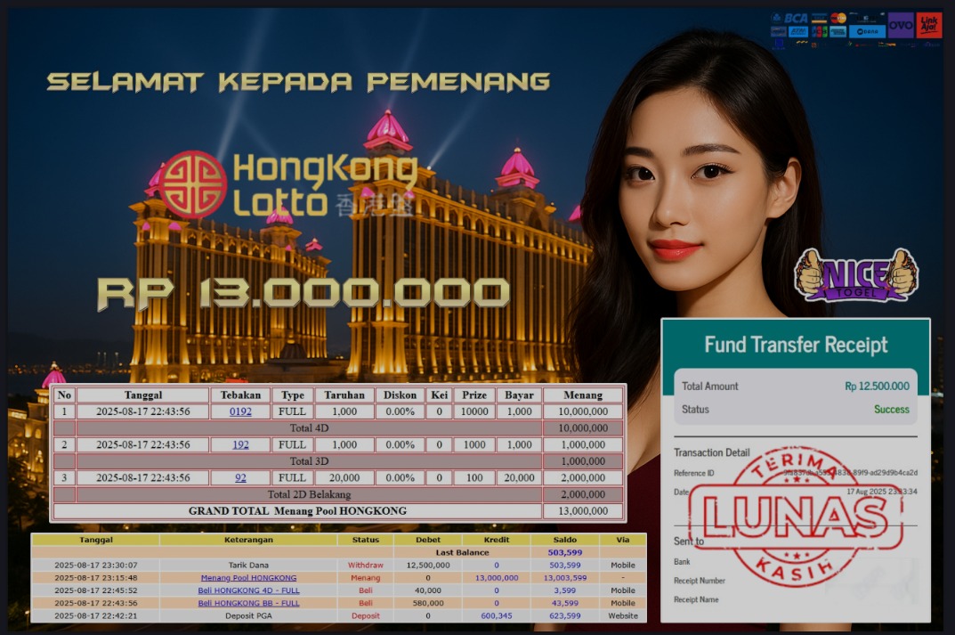 Selamat kepada User id : LOKJ** Telah berhasil mendapatkan kemenangan besar pada permainan JACKPOT TOGEL HONGKONG LOTTO Dengan kemenangan Sebesar Rp.13.000.000.00,- Setelah mengisi formulir withdraw dengan kurung waktu hanya 5 – 10 menit pihak NICETOGEL sudah melakukan transfer kepada pemilik Userid dan dana sudah dapat di cairkan oleh pemenang. Bukti pembayaran yang kami berikan merupakan bukti pembayaran yang SAH / VALID yang langung di dapatkan melaui tanda transfer transaksi dari Bank yang di tuju.