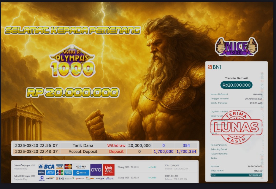 Selamat kepada User id : DESR21*** Telah berhasil mendapatkan kemenangan besar pada permainan JACKPOT SLOT GATES OF OLYMPUS 1000 Dengan kemenangan Sebesar Rp.20.000.000,- Setelah mengisi formulir withdraw dengan kurung waktu hanya 5 – 10 menit pihak NICETOGEL sudah melakukan transfer kepada pemilik Userid dan dana sudah dapat di cairkan oleh pemenang. Bukti pembayaran yang kami berikan merupakan bukti pembayaran yang SAH / VALID yang langung di dapatkan melaui tanda transfer transaksi dari Bank yang di tuju.
