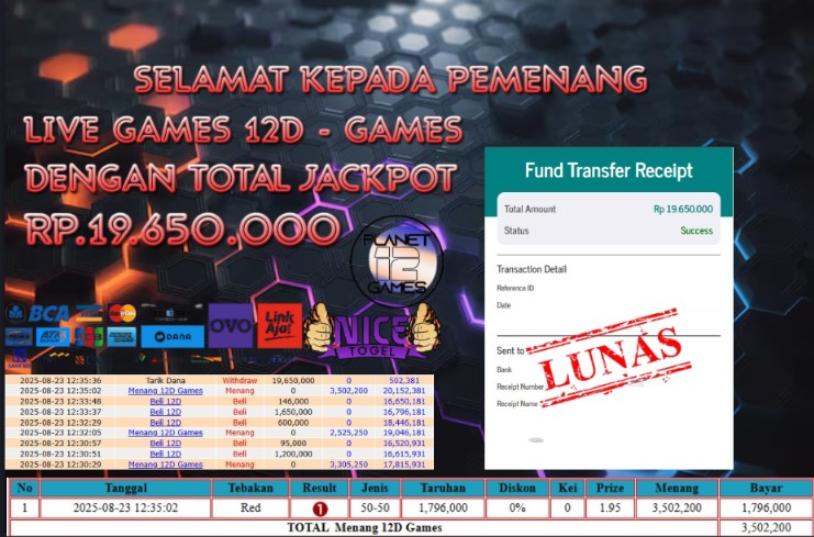 Selamat kepada User id : RIAN0** Telah berhasil mendapatkan kemenangan besar pada permainan JACKPOT 12D LIVE GAME Dengan kemenangan Sebesar Rp.19.650.000,- Setelah mengisi formulir withdraw dengan kurung waktu hanya 5 – 10 menit pihak NICETOGEL sudah melakukan transfer kepada pemilik Userid dan dana sudah dapat di cairkan oleh pemenang. Bukti pembayaran yang kami berikan merupakan bukti pembayaran yang SAH / VALID yang langung di dapatkan melaui tanda transfer transaksi dari Bank yang di tuju.
