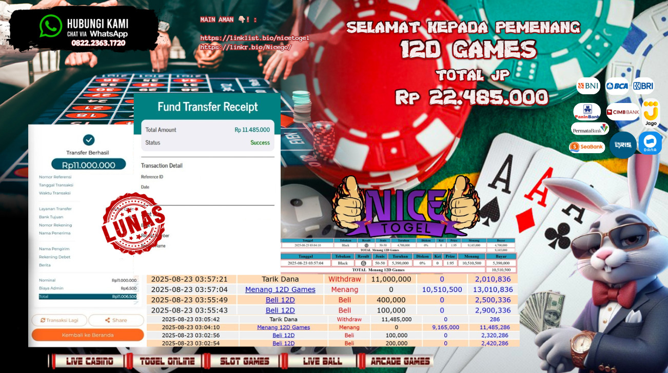 Selamat kepada User id : AMAD** Telah berhasil mendapatkan kemenangan besar pada permainan JACKPOT 12D SPIN LIVE GAME Dengan kemenangan Sebesar Rp.22.485.000,- Setelah mengisi formulir withdraw dengan kurung waktu hanya 5 – 10 menit pihak NICETOGEL sudah melakukan transfer kepada pemilik Userid dan dana sudah dapat di cairkan oleh pemenang. Bukti pembayaran yang kami berikan merupakan bukti pembayaran yang SAH / VALID yang langung di dapatkan melaui tanda transfer transaksi dari Bank yang di tuju.