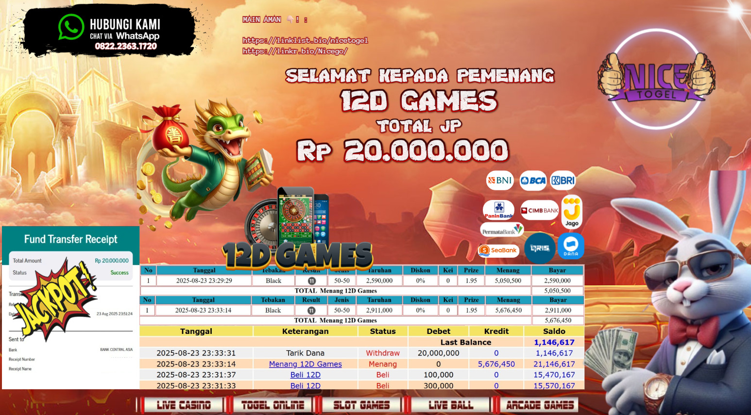 Selamat kepada User id : IQBA** Telah berhasil mendapatkan kemenangan besar pada permainan JACKPOT 12D LIVE GAME Dengan kemenangan Sebesar Rp.20.000.000,- Setelah mengisi formulir withdraw dengan kurung waktu hanya 5 – 10 menit pihak NICETOGEL sudah melakukan transfer kepada pemilik Userid dan dana sudah dapat di cairkan oleh pemenang. Bukti pembayaran yang kami berikan merupakan bukti pembayaran yang SAH / VALID yang langung di dapatkan melaui tanda transfer transaksi dari Bank yang di tuju.