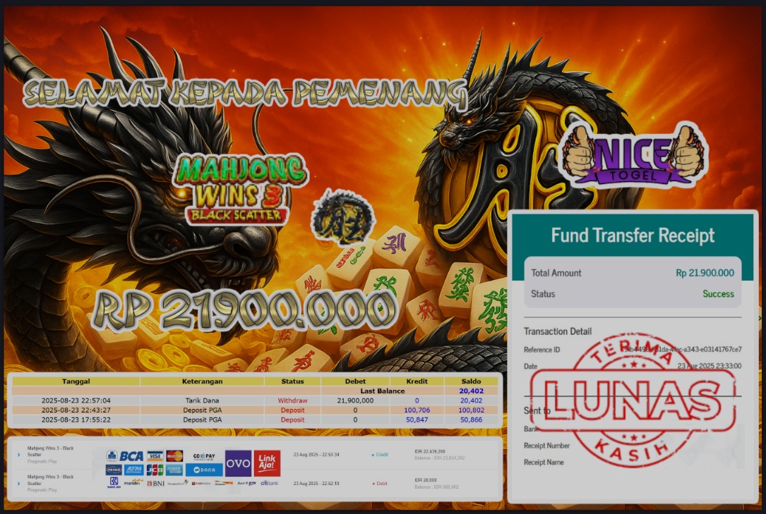 Selamat kepada User id : LUCK** Telah berhasil mendapatkan kemenangan besar pada permainan JACKPOT SLOT MAHJONG WINS3 Dengan kemenangan Sebesar Rp.21.900.000,- Setelah mengisi formulir withdraw dengan kurung waktu hanya 5 – 10 menit pihak NICETOGEL sudah melakukan transfer kepada pemilik Userid dan dana sudah dapat di cairkan oleh pemenang. Bukti pembayaran yang kami berikan merupakan bukti pembayaran yang SAH / VALID yang langung di dapatkan melaui tanda transfer transaksi dari Bank yang di tuju.