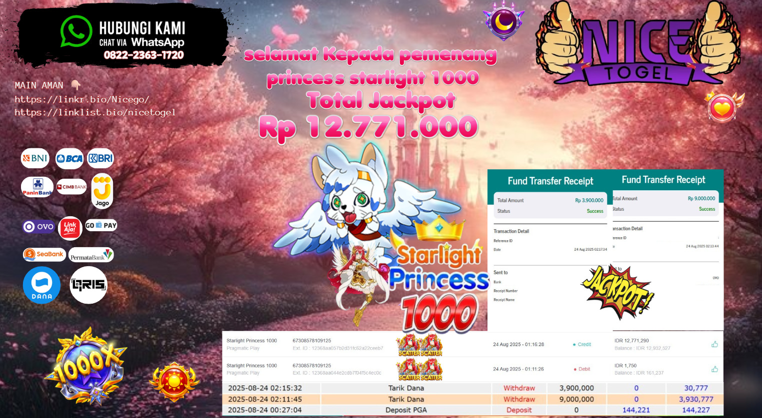 Selamat kepada User id : JHOA1** Telah berhasil mendapatkan kemenangan besar pada permainan JACKPOT SLOT PRINCESS STARLIGTH 1000 Dengan kemenangan Sebesar Rp.12.771.000,- Setelah mengisi formulir withdraw dengan kurung waktu hanya 5 – 10 menit pihak NICETOGEL sudah melakukan transfer kepada pemilik Userid dan dana sudah dapat di cairkan oleh pemenang. Bukti pembayaran yang kami berikan merupakan bukti pembayaran yang SAH / VALID yang langung di dapatkan melaui tanda transfer transaksi dari Bank yang di tuju.