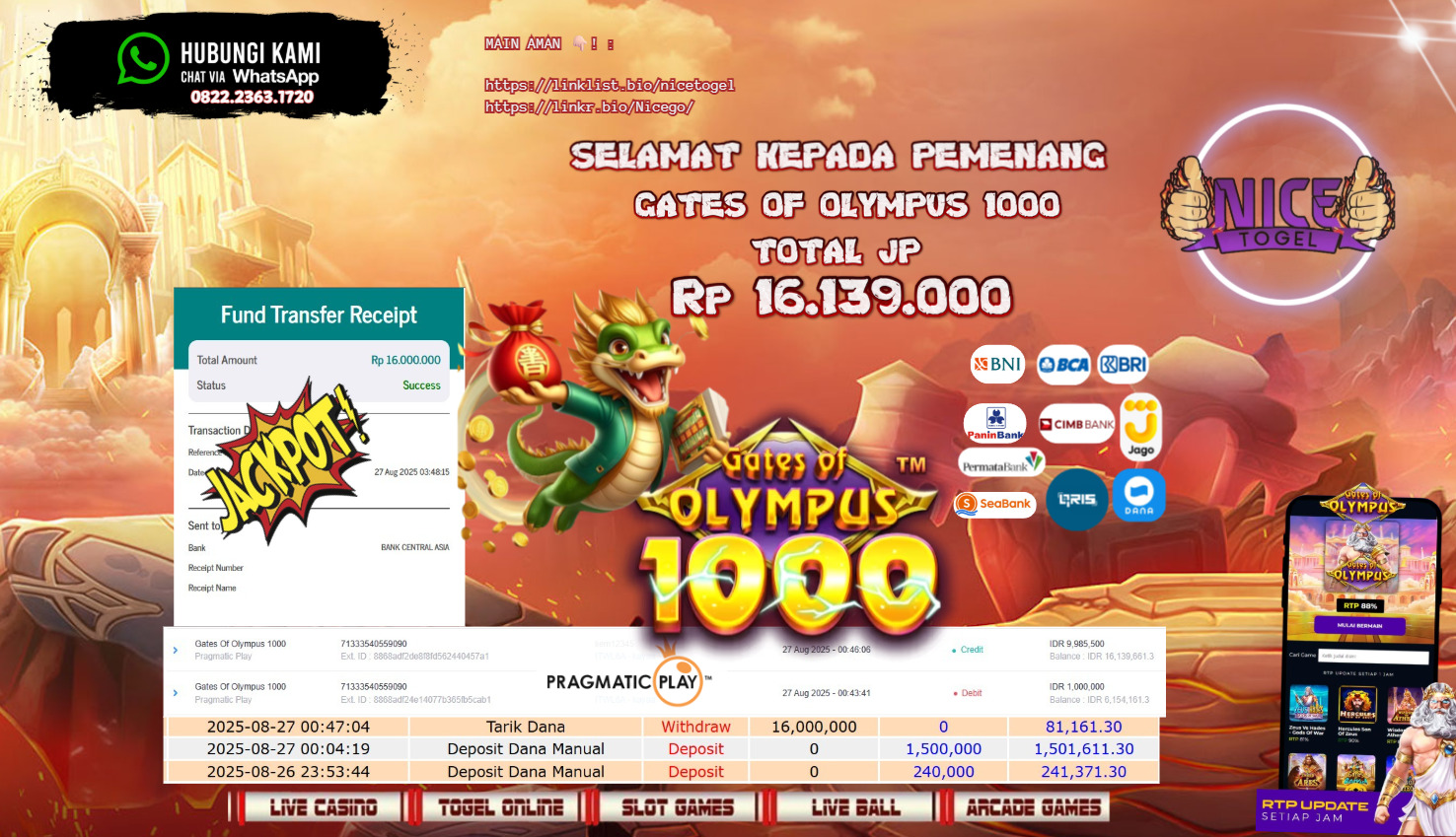 Selamat kepada User id : MINS00** Telah berhasil mendapatkan kemenangan besar pada permainan JACKPOT SLOT GATES OF OLYMPUS 1000 Dengan kemenangan Sebesar Rp.16.139.000,- Setelah mengisi formulir withdraw dengan kurung waktu hanya 5 – 10 menit pihak NICETOGEL sudah melakukan transfer kepada pemilik Userid dan dana sudah dapat di cairkan oleh pemenang. Bukti pembayaran yang kami berikan merupakan bukti pembayaran yang SAH / VALID yang langung di dapatkan melaui tanda transfer transaksi dari Bank yang di tuju.