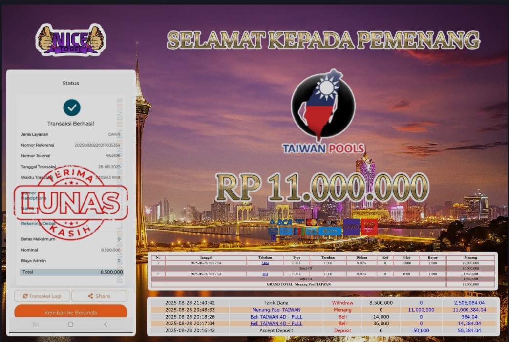 Selamat kepada User id : APE23*** Telah berhasil mendapatkan kemenangan besar pada permainan JACKPOT TOGEL TAIWAN Dengan kemenangan Sebesar Rp.11.000.000,- Setelah mengisi formulir withdraw dengan kurung waktu hanya 5 – 10 menit pihak NICETOGEL sudah melakukan transfer kepada pemilik Userid dan dana sudah dapat di cairkan oleh pemenang. Bukti pembayaran yang kami berikan merupakan bukti pembayaran yang SAH / VALID yang langung di dapatkan melaui tanda transfer transaksi dari Bank yang di tuju.