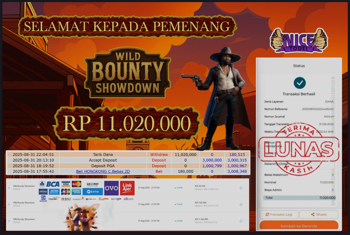Selamat kepada User id : APE23*** Telah berhasil mendapatkan kemenangan besar pada permainan WILD BOUNTY SHOWDOWN Dengan kemenangan Sebesar Rp.11.020.000,- Setelah mengisi formulir withdraw dengan kurung waktu hanya 5 – 10 menit pihak NICETOGEL sudah melakukan transfer kepada pemilik Userid dan dana sudah dapat di cairkan oleh pemenang. Bukti pembayaran yang kami berikan merupakan bukti pembayaran yang SAH / VALID yang langung di dapatkan melaui tanda transfer transaksi dari Bank yang di tuju.