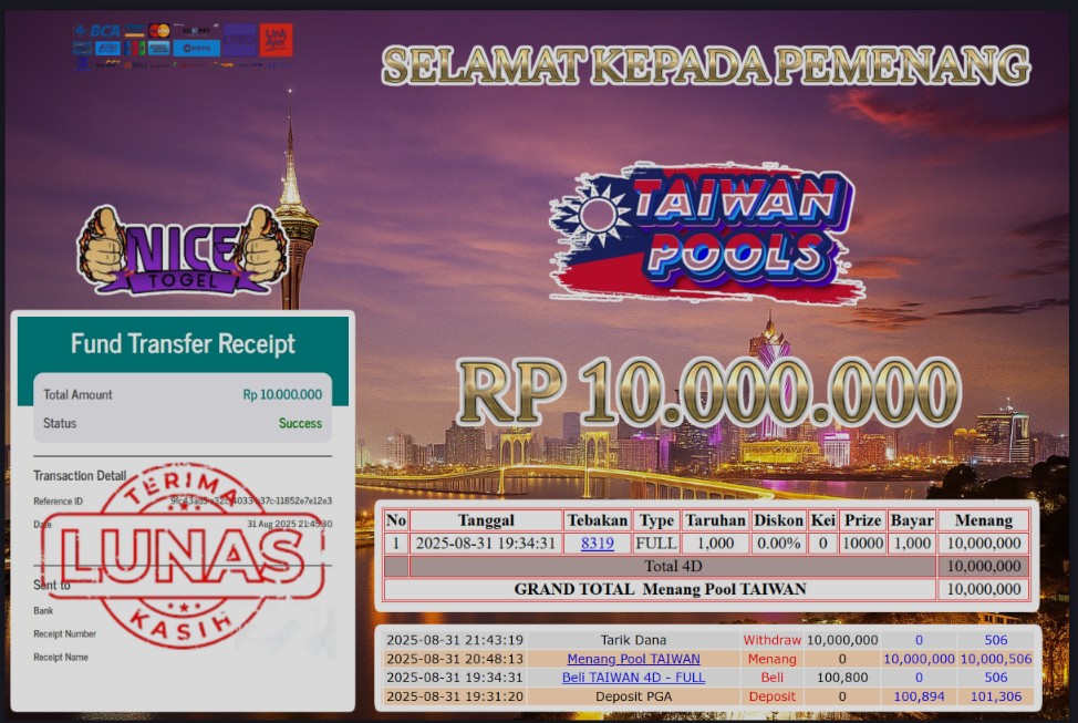 Selamat kepada User id : APE23*** Telah berhasil mendapatkan kemenangan besar pada permainan JACKPOT TOGEL TAIWAN Dengan kemenangan Sebesar Rp.10.000.000,- Setelah mengisi formulir withdraw dengan kurung waktu hanya 5 – 10 menit pihak NICETOGEL sudah melakukan transfer kepada pemilik Userid dan dana sudah dapat di cairkan oleh pemenang. Bukti pembayaran yang kami berikan merupakan bukti pembayaran yang SAH / VALID yang langung di dapatkan melaui tanda transfer transaksi dari Bank yang di tuju.