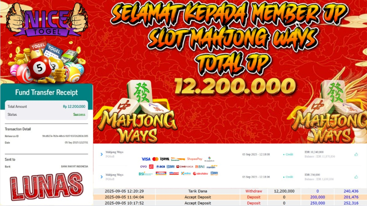 Selamat kepada User id : AMI*D*J Telah berhasil mendapatkan kemenangan besar pada permainan JACKPOT SLOT MAHJONG WAYS Dengan kemenangan Sebesar Rp.12.200.000,- Setelah mengisi formulir withdraw dengan kurung waktu hanya 5 – 10 menit pihak NICETOGEL sudah melakukan transfer kepada pemilik Userid dan dana sudah dapat di cairkan oleh pemenang. Bukti pembayaran yang kami berikan merupakan bukti pembayaran yang SAH / VALID yang langung di dapatkan melaui tanda transfer transaksi dari Bank yang di tuju.