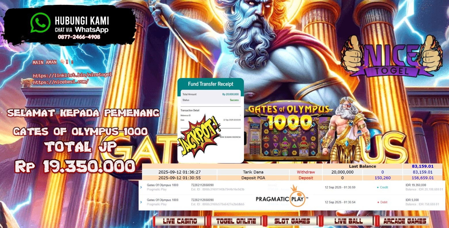 Selamat kepada User id : JEJE** Telah berhasil mendapatkan kemenangan besar pada permainan JACKPOT SLOT GATES OF OLYMPUS 1000 Dengan kemenangan Sebesar Rp.19.350.000,- Setelah mengisi formulir withdraw dengan kurung waktu hanya 5 – 10 menit pihak NICETOGEL sudah melakukan transfer kepada pemilik Userid dan dana sudah dapat di cairkan oleh pemenang. Bukti pembayaran yang kami berikan merupakan bukti pembayaran yang SAH / VALID yang langung di dapatkan melaui tanda transfer transaksi dari Bank yang di tuju.