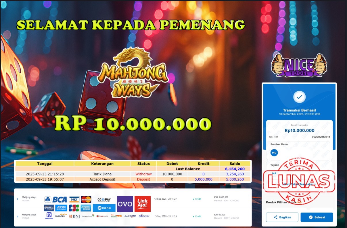Selamat kepada User id : jerr** Telah berhasil mendapatkan kemenangan besar pada permainan JACKPOT SLOT MAHYONG WAYS Dengan kemenangan Sebesar Rp.10.000.000,- Setelah mengisi formulir withdraw dengan kurung waktu hanya 5 – 10 menit pihak NICETOGEL sudah melakukan transfer kepada pemilik Userid dan dana sudah dapat di cairkan oleh pemenang. Bukti pembayaran yang kami berikan merupakan bukti pembayaran yang SAH / VALID yang langung di dapatkan melaui tanda transfer transaksi dari Bank yang di tuju.