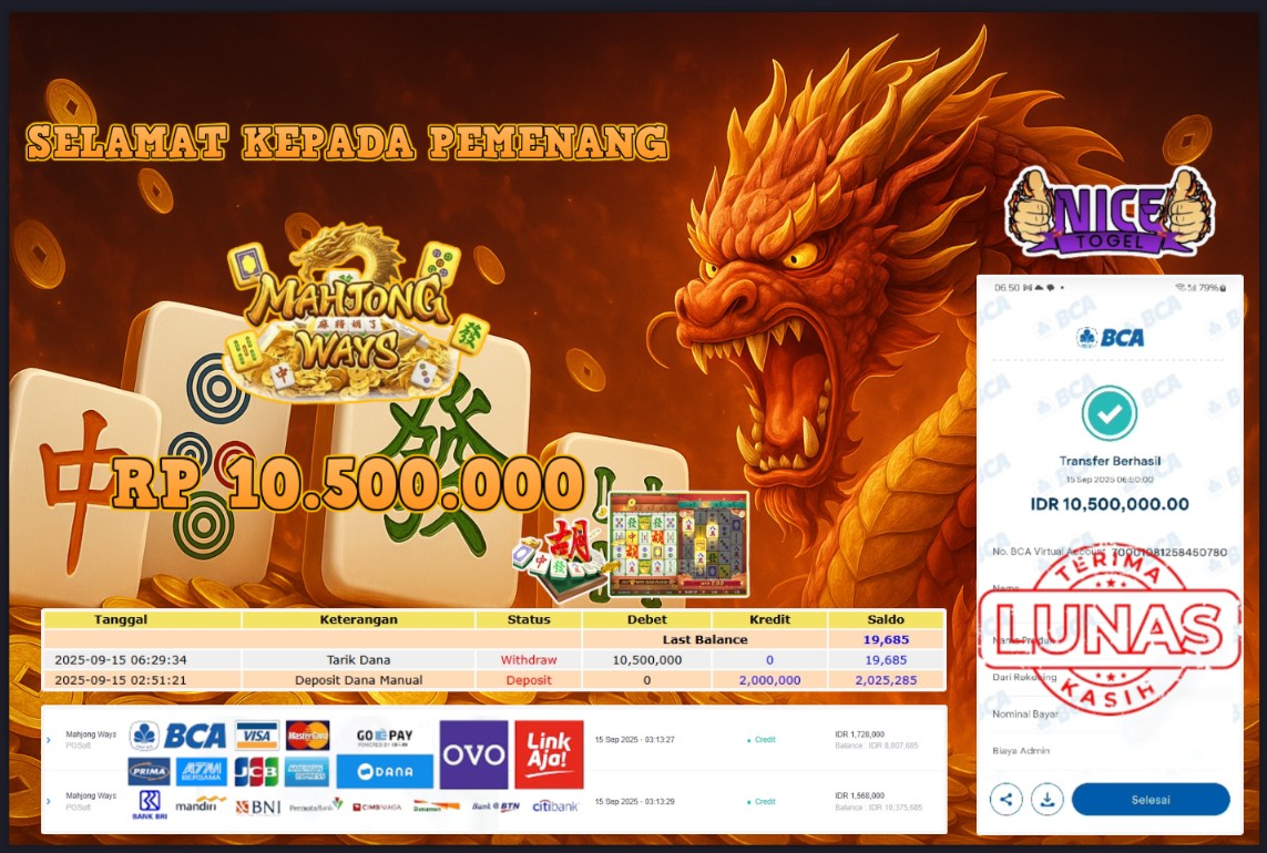 Selamat kepada User id : APE23** Telah berhasil mendapatkan kemenangan besar pada permainan JACKPOT SLOT MAHYONG WAYS Dengan kemenangan Sebesar Rp.10.500.000,- Setelah mengisi formulir withdraw dengan kurung waktu hanya 5 – 10 menit pihak NICETOGEL sudah melakukan transfer kepada pemilik Userid dan dana sudah dapat di cairkan oleh pemenang. Bukti pembayaran yang kami berikan merupakan bukti pembayaran yang SAH / VALID yang langung di dapatkan melaui tanda transfer transaksi dari Bank yang di tuju.