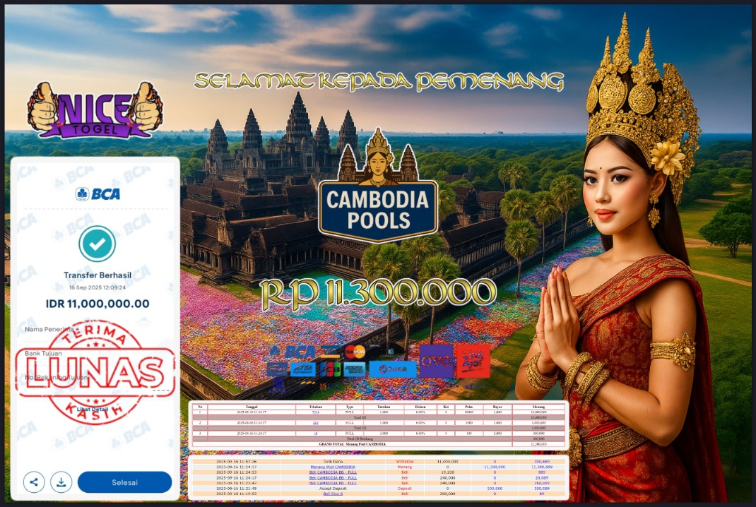 Selamat kepada member NICETOGEL User id : APE23** Telah berhasil mendapatkan kemenangan besar pada permainan JACKPOT TOGEL CAMBODIA POOLS Dengan kemenangan Sebesar Rp.11.300.000,- Setelah mengisi formulir withdraw dengan kurung waktu hanya 5 – 10 menit pihak NICETOGEL sudah melakukan transfer kepada pemilik Userid dan dana sudah dapat di cairkan oleh pemenang. Bukti pembayaran yang kami berikan merupakan bukti pembayaran yang SAH / VALID yang langung di dapatkan melaui tanda transfer transaksi dari Bank yang di tuju.