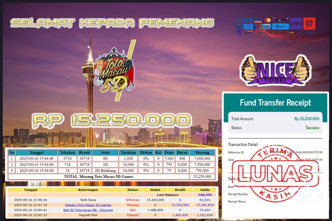 Selamat kepada member NICETOGEL User id :APE23**** Telah berhasil mendapatkan kemenangan besar pada permainan JACKPOT TOGEL TOTO MACAU 5D Dengan kemenangan Sebesar Rp.15.250.000,- Setelah mengisi formulir withdraw dengan kurung waktu hanya 5 – 10 menit pihak NICETOGEL sudah melakukan transfer kepada pemilik Userid dan dana sudah dapat di cairkan oleh pemenang. Bukti pembayaran yang kami berikan merupakan bukti pembayaran yang SAH / VALID yang langung di dapatkan melaui tanda transfer transaksi dari Bank yang di tuju.