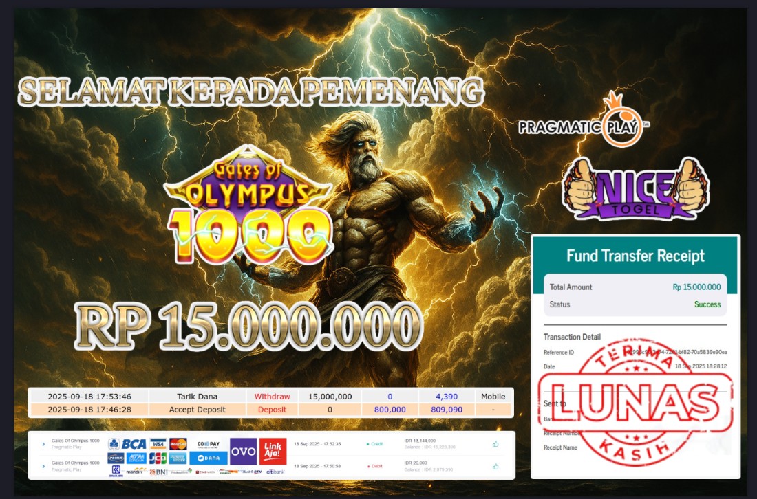 Selamat kepada User id : APE23** Telah berhasil mendapatkan kemenangan besar pada permainan JACKPOT SLOT GATES OF OLYMPUS 1000 Dengan kemenangan Sebesar Rp.15.000.000,- Setelah mengisi formulir withdraw dengan kurung waktu hanya 5 – 10 menit pihak NICETOGEL sudah melakukan transfer kepada pemilik Userid dan dana sudah dapat di cairkan oleh pemenang. Bukti pembayaran yang kami berikan merupakan bukti pembayaran yang SAH / VALID yang langung di dapatkan melaui tanda transfer transaksi dari Bank yang di tuju.