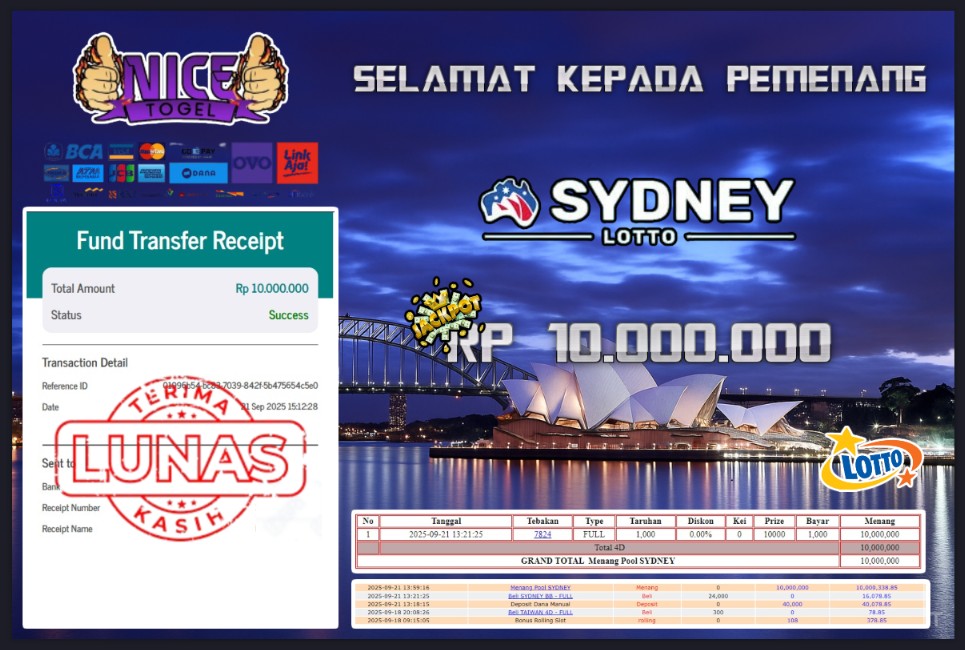 Selamat kepada User id : APE23** Telah berhasil mendapatkan kemenangan besar pada permainan JACKPOT TOGEL SYDNEY LOTTO Dengan kemenangan Sebesar Rp.10.000.000,- Setelah mengisi formulir withdraw dengan kurung waktu hanya 5 – 10 menit pihak NICETOGEL sudah melakukan transfer kepada pemilik Userid dan dana sudah dapat di cairkan oleh pemenang. Bukti pembayaran yang kami berikan merupakan bukti pembayaran yang SAH / VALID yang langung di dapatkan melaui tanda transfer transaksi dari Bank yang di tuju.