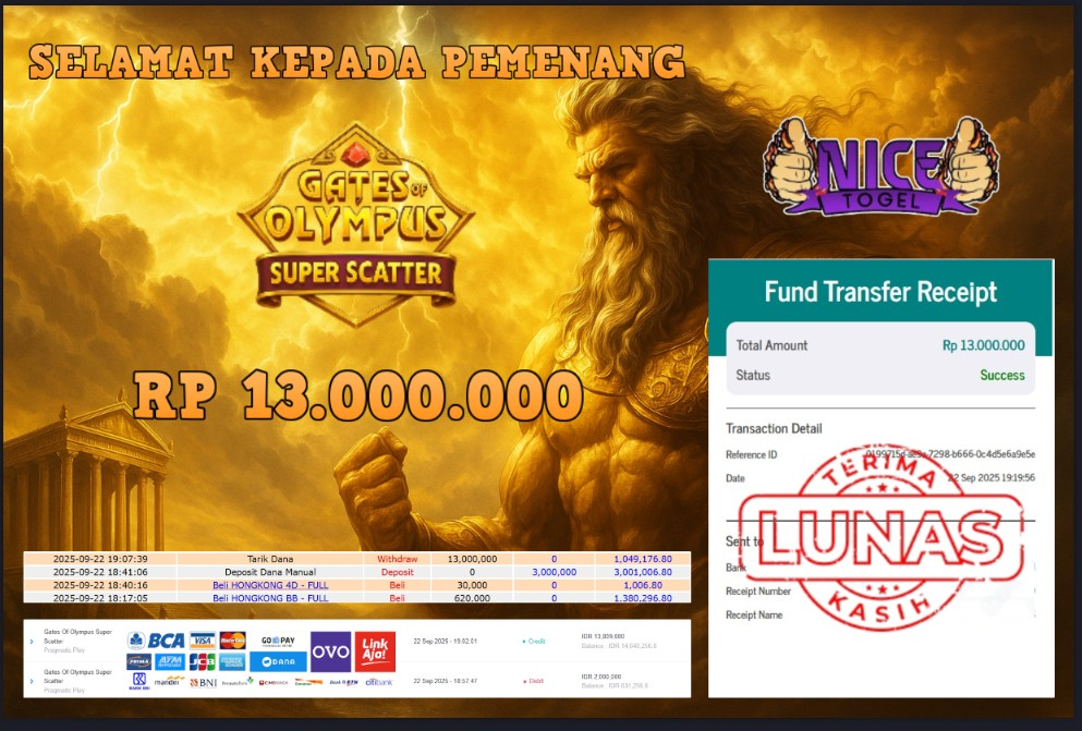Selamat kepada member NICETOGEL User id :adn53**** Telah berhasil mendapatkan kemenangan besar pada permainan JACKPOT SLOT GATES OF OLYMPUS SUPER SCATTER Dengan kemenangan Sebesar Rp.13.000.000,- Setelah mengisi formulir withdraw dengan kurung waktu hanya 5 – 10 menit pihak NICETOGEL sudah melakukan transfer kepada pemilik Userid dan dana sudah dapat di cairkan oleh pemenang. Bukti pembayaran yang kami berikan merupakan bukti pembayaran yang SAH / VALID yang langung di dapatkan melaui tanda transfer transaksi dari Bank yang di tuju.