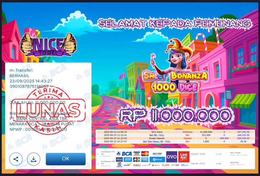 Selamat kepada User id : APE23*** Telah berhasil mendapatkan kemenangan besar pada permainan JACKPOT SLOT SWEET BONANZA 1000 DICE Dengan kemenangan Sebesar Rp.11.000.000,- Setelah mengisi formulir withdraw dengan kurung waktu hanya 5 – 10 menit pihak NICETOGEL sudah melakukan transfer kepada pemilik Userid dan dana sudah dapat di cairkan oleh pemenang. Bukti pembayaran yang kami berikan merupakan bukti pembayaran yang SAH / VALID yang langung di dapatkan melaui tanda transfer transaksi dari Bank yang di tuju.