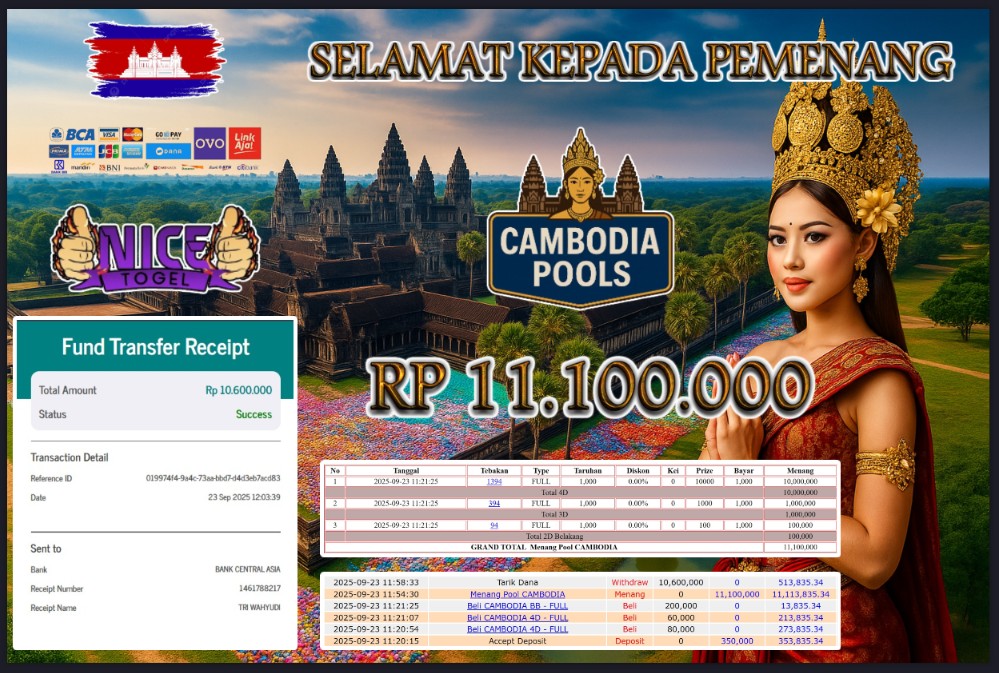 Selamat kepada member NICETOGEL User id : APE23** Telah berhasil mendapatkan kemenangan besar pada permainan JACKPOT TOGEL CAMBODIA POOLS Dengan kemenangan Sebesar Rp.11.100.000,- Setelah mengisi formulir withdraw dengan kurung waktu hanya 5 – 10 menit pihak NICETOGEL sudah melakukan transfer kepada pemilik Userid dan dana sudah dapat di cairkan oleh pemenang. Bukti pembayaran yang kami berikan merupakan bukti pembayaran yang SAH / VALID yang langung di dapatkan melaui tanda transfer transaksi dari Bank yang di tuju.
