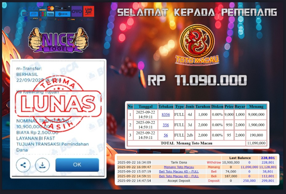 Selamat kepada member NICETOGEL User id :LID784**** Telah berhasil mendapatkan kemenangan besar pada permainan JACKPOT TOGEL TOTO MACAU Dengan kemenangan Sebesar Rp.11.090.000,- Setelah mengisi formulir withdraw dengan kurung waktu hanya 5 – 10 menit pihak NICETOGEL sudah melakukan transfer kepada pemilik Userid dan dana sudah dapat di cairkan oleh pemenang. Bukti pembayaran yang kami berikan merupakan bukti pembayaran yang SAH / VALID yang langung di dapatkan melaui tanda transfer transaksi dari Bank yang di tuju.
