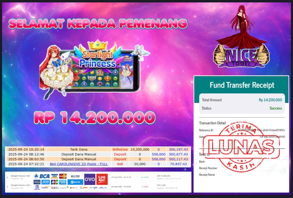 Selamat kepada User id : APE23** Telah berhasil mendapatkan kemenangan besar pada permainan JACKPOT SLOT STARLIGHT PRINCESS 1000 Dengan kemenangan Sebesar Rp.11.500.000,- Setelah mengisi formulir withdraw dengan kurung waktu hanya 5 – 10 menit pihak NICETOGEL sudah melakukan transfer kepada pemilik Userid dan dana sudah dapat di cairkan oleh pemenang. Bukti pembayaran yang kami berikan merupakan bukti pembayaran yang SAH / VALID yang langung di dapatkan melaui tanda transfer transaksi dari Bank yang di tuju.