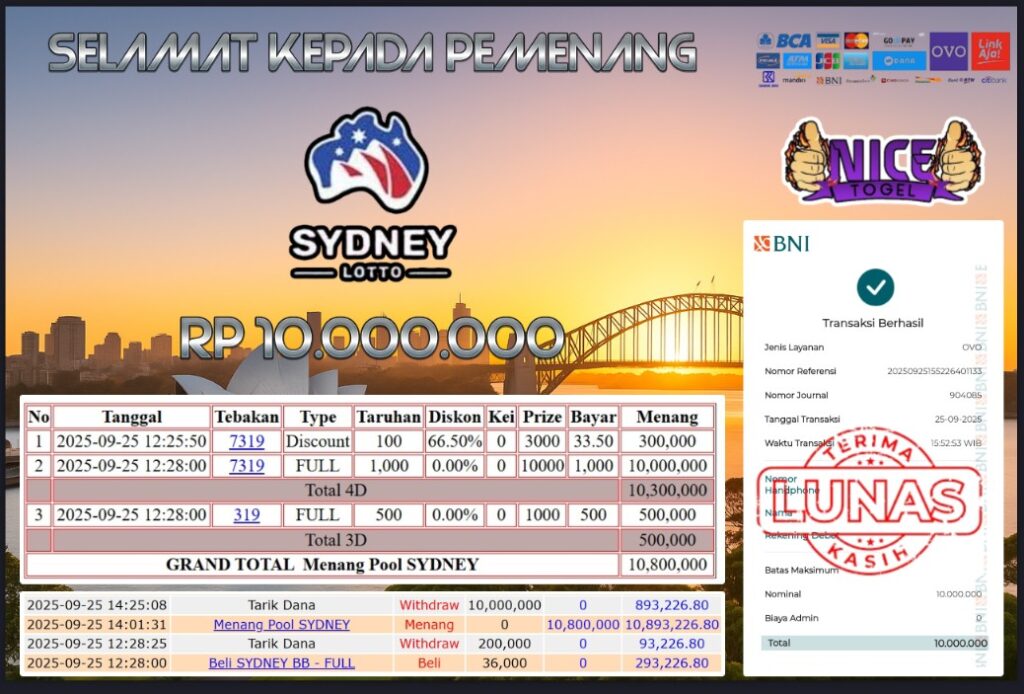 BUKTI JACKPOT TOGEL SYDNEY LOTTO Rp 10.000.000,- LUNAS