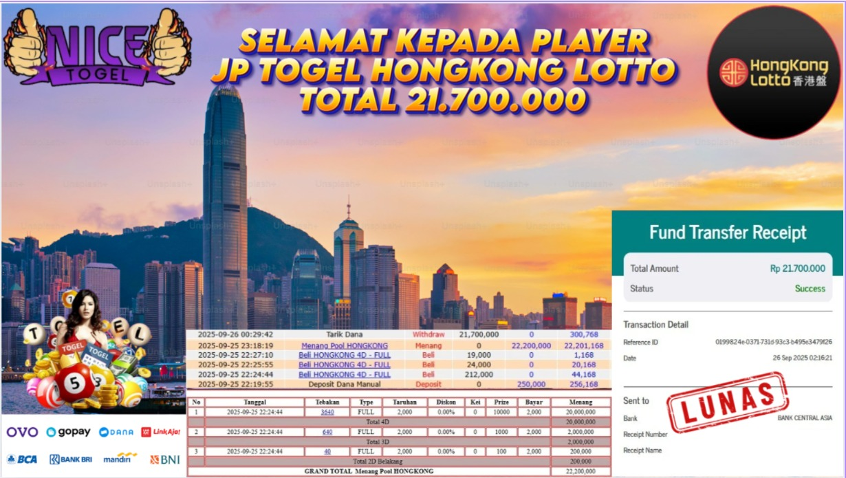 Selamat kepada User id : APE23** Telah berhasil mendapatkan kemenangan besar pada permainan JACKPOT TOGEL HONGKONG LOTTO Dengan kemenangan Sebesar Rp.21.700.000,- Setelah mengisi formulir withdraw dengan kurung waktu hanya 5 – 10 menit pihak NICETOGEL sudah melakukan transfer kepada pemilik Userid dan dana sudah dapat di cairkan oleh pemenang. Bukti pembayaran yang kami berikan merupakan bukti pembayaran yang SAH / VALID yang langung di dapatkan melaui tanda transfer transaksi dari Bank yang di tuju.