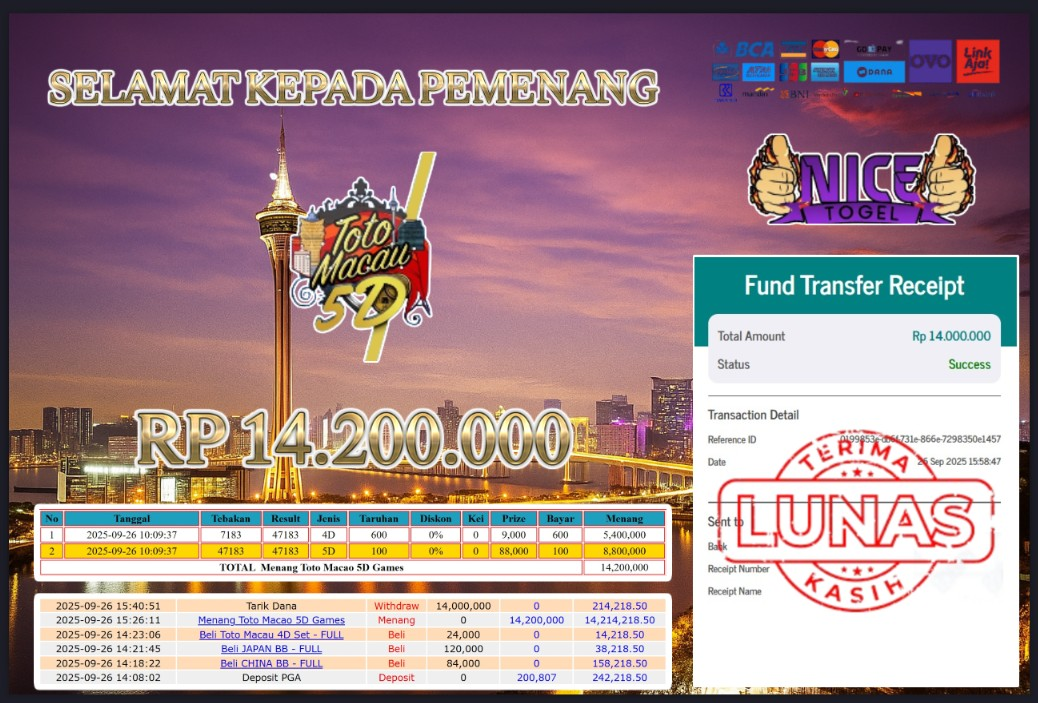 Selamat kepada User id : RARA** Telah berhasil mendapatkan kemenangan besar pada permainan JACKPOT TOGEL TOTOMACAU 5D Dengan kemenangan Sebesar Rp.14.200.000 ,- Setelah mengisi formulir withdraw dengan kurung waktu hanya 5 – 10 menit pihak NICETOGEL sudah melakukan transfer kepada pemilik Userid dan dana sudah dapat di cairkan oleh pemenang. Bukti pembayaran yang kami berikan merupakan bukti pembayaran yang SAH / VALID yang langung di dapatkan melaui tanda transfer transaksi dari Bank yang di tuju.